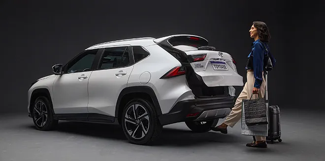 El Yaris Cross ofrece portón trasero con sistema de apertura y cierre eléctrico con sensor "manos libres“, cámara de estacionamiento 360° y asientos tapizados de cuero ecológico microperforado. (Disponible en versiones SEG).